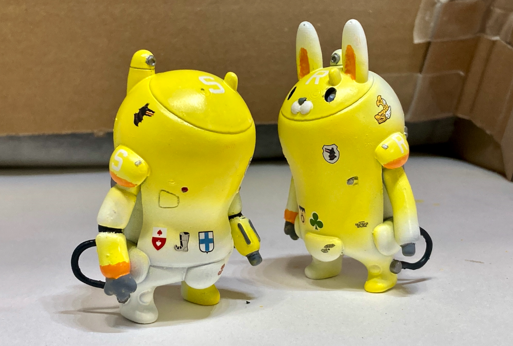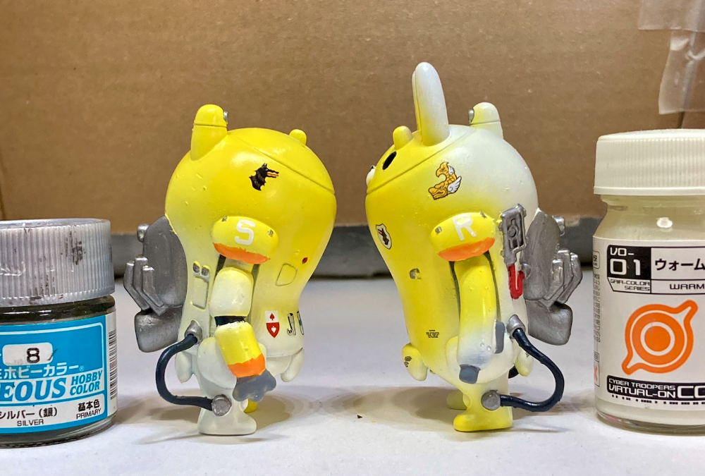 ↑で、当時アクリルガッシュで仕上げたのがこのドクロマークのファイアボール。右肘のシワをかっこつけてたしかパテで作ったら角度が不自然に笑。20年後に作ったパチもんと並べて。同じ白×黄な色味ですね。変わってない…