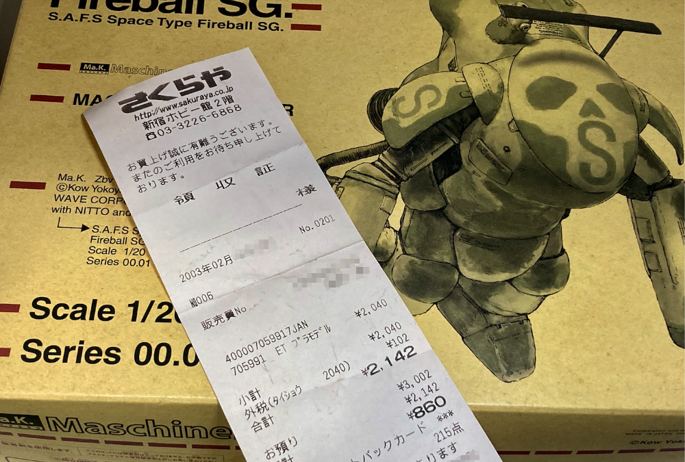 ↑初めて購入したマシーネンプラモは「ファイアボールSG.」というタイプのS.A.F.S.でした。マシーネンとかまっっっったく知らなくて完全にジャケ買い。レシートも一緒にしまってあって見たら2003年でした。22年前?昔は安かったー